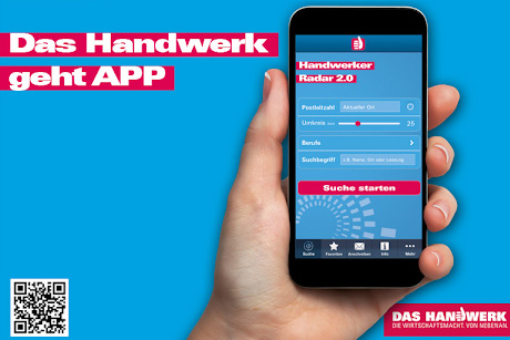 Das Handwerkerradar ist das mobile Portal des Handwerks. Mit der kostenfreien App der Handwerkskammer können Verbraucher schnell und gezielt den passenden Handwerksbetrieb in der unmittelbaren Nähe finden. Die App greift auf die Daten der Handwerkersuche zu und bietet dank der komfortablen Suchfunktionen einen schnellen, direkten und flexiblen Kontakt zu den gelisteten Betrieben.
